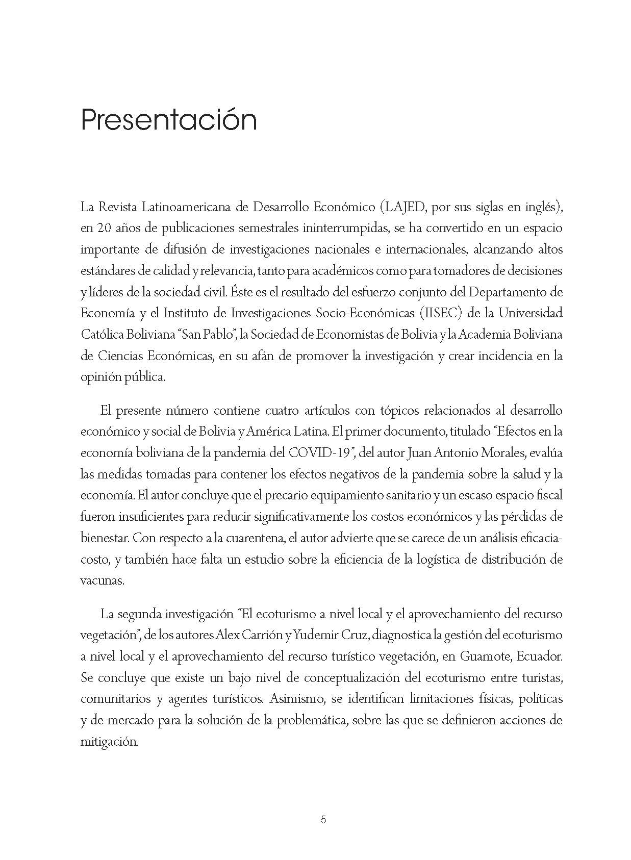 La Revista Latinoamericana de Desarrollo Económico (LAJED, por sus siglas en inglés), en 20 años de publicaciones semestrales ininterrumpidas, se ha convertido en un espacio importante de difusión de investigaciones nacionales e internacionales, alcanzando altos estándares de calidad y relevancia, tanto para académicos como para tomadores de decisiones y líderes de la sociedad civil. Éste es el resultado del esfuerzo conjunto del Departamento de Economía y el Instituto de Investigaciones Socio-Económicas (IISEC) de la Universidad Católica Boliviana “San Pablo”, la Sociedad de Economistas de Bolivia y la Academia Boliviana de Ciencias Económicas, en su afán de promover la investigación y crear incidencia en la opinión pública. El presente número contiene cuatro artículos con tópicos relacionados al desarrollo económico y social de Bolivia y América Latina.